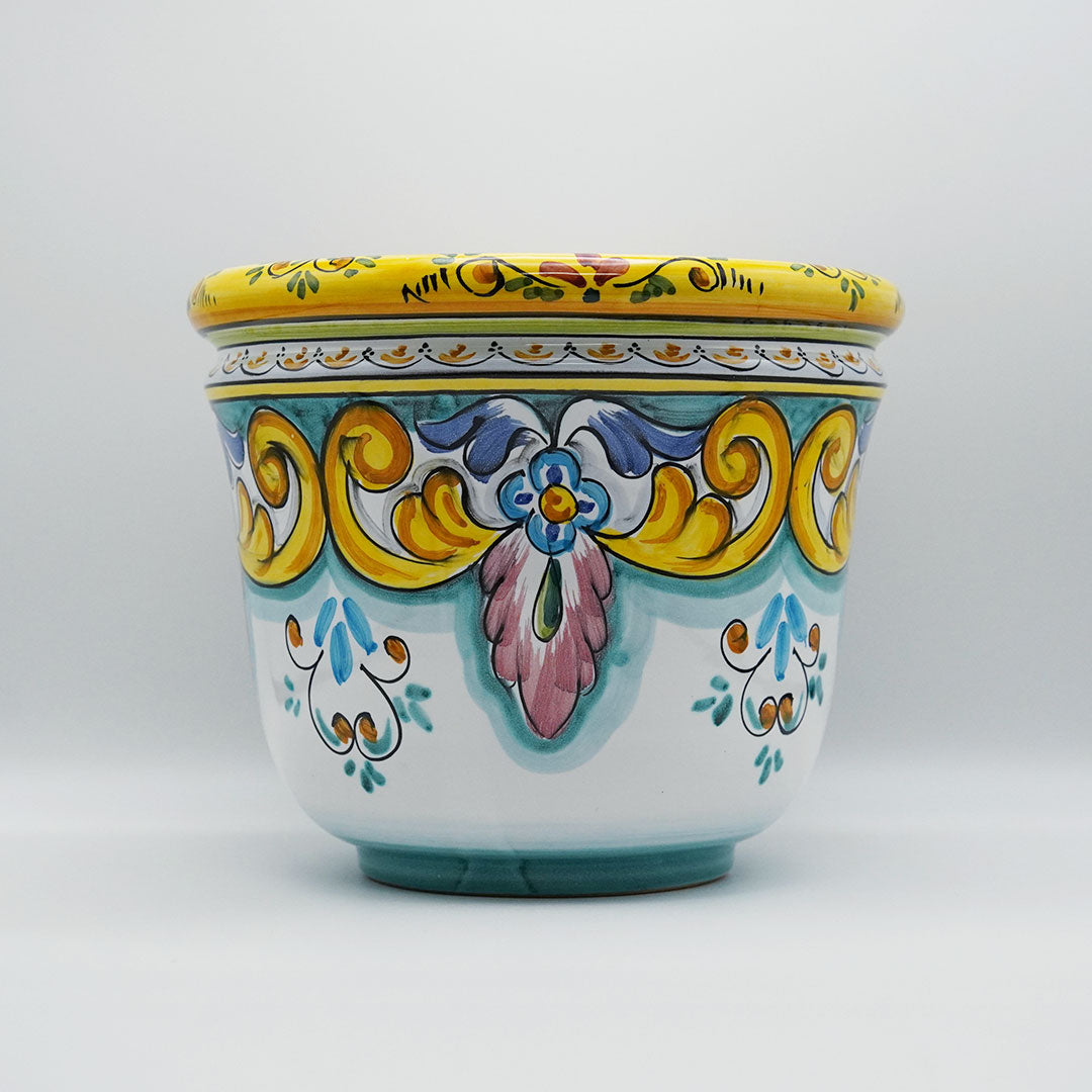Caspo är ett autentiskt italienskt hantverk, varje detalj är noggrant utförd med en vacker färgkombination av turkost, gult och vitt med detaljer i rosa. Det karakteristiska mönstret ger krukan en tidlös charm som passar perfekt i både klassiska och moderna inredningar.