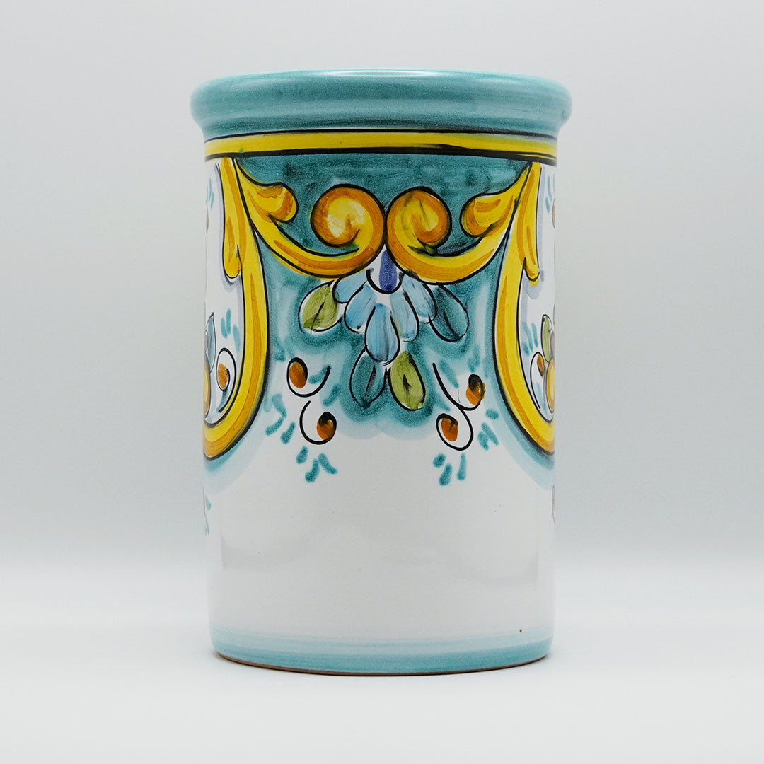 Contenitore håller dina köksverktyg organiserade och samtidigt en fin detalj i köket. Varje exemplar är noggrant handmålat i harmoniska toner av turkost, vitt och gult med rosa detaljer.