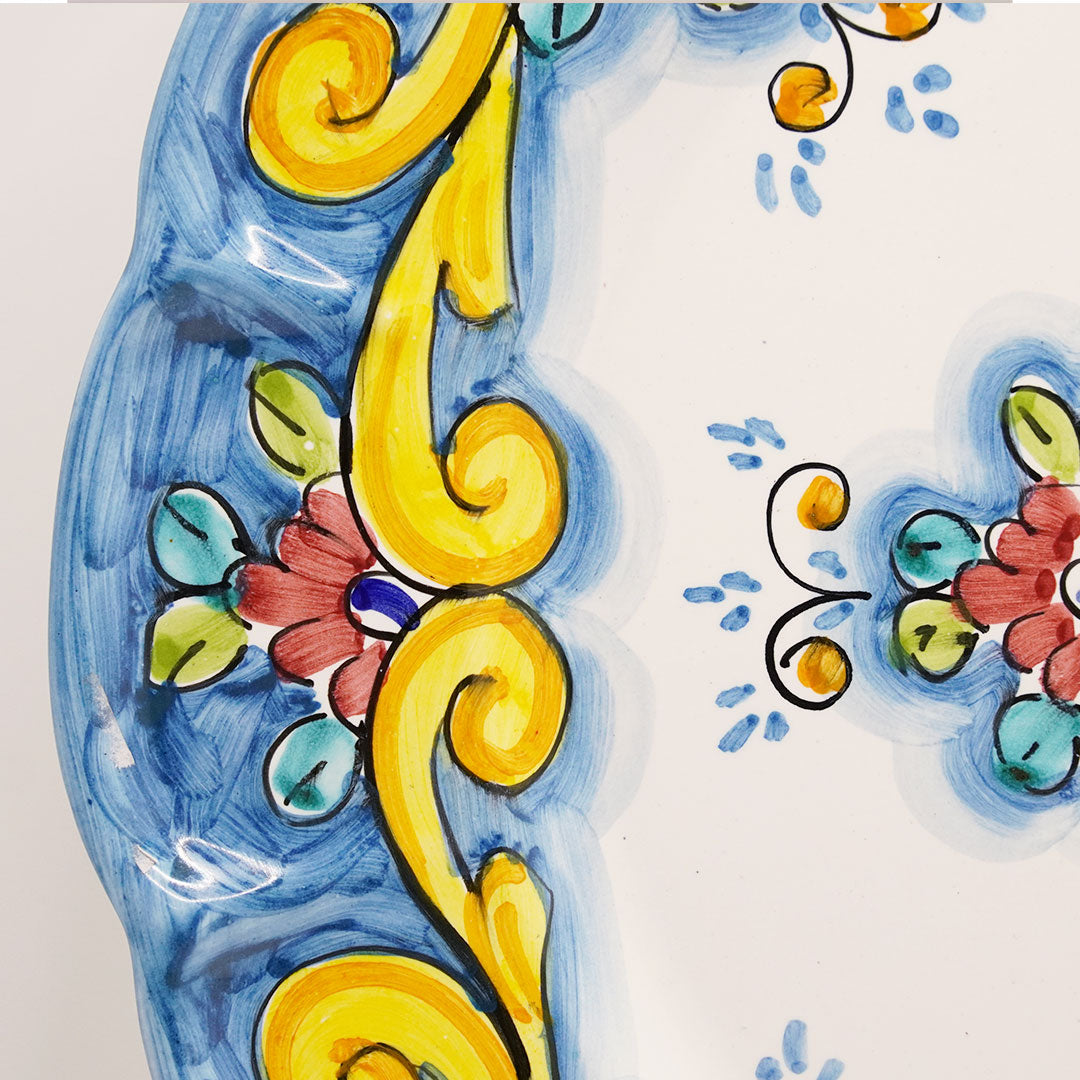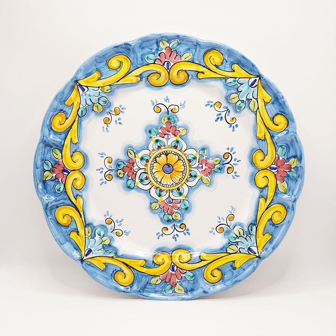 Piatto Barocco är ett handmålat upplägningsfat i ett barockt mönster i en harmonisk palett av ljusblått, gult och vitt med subtila rosa detaljer. Fatet är både praktisk och dekorativt för servering eller som prydnad.