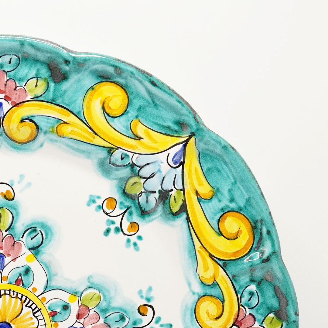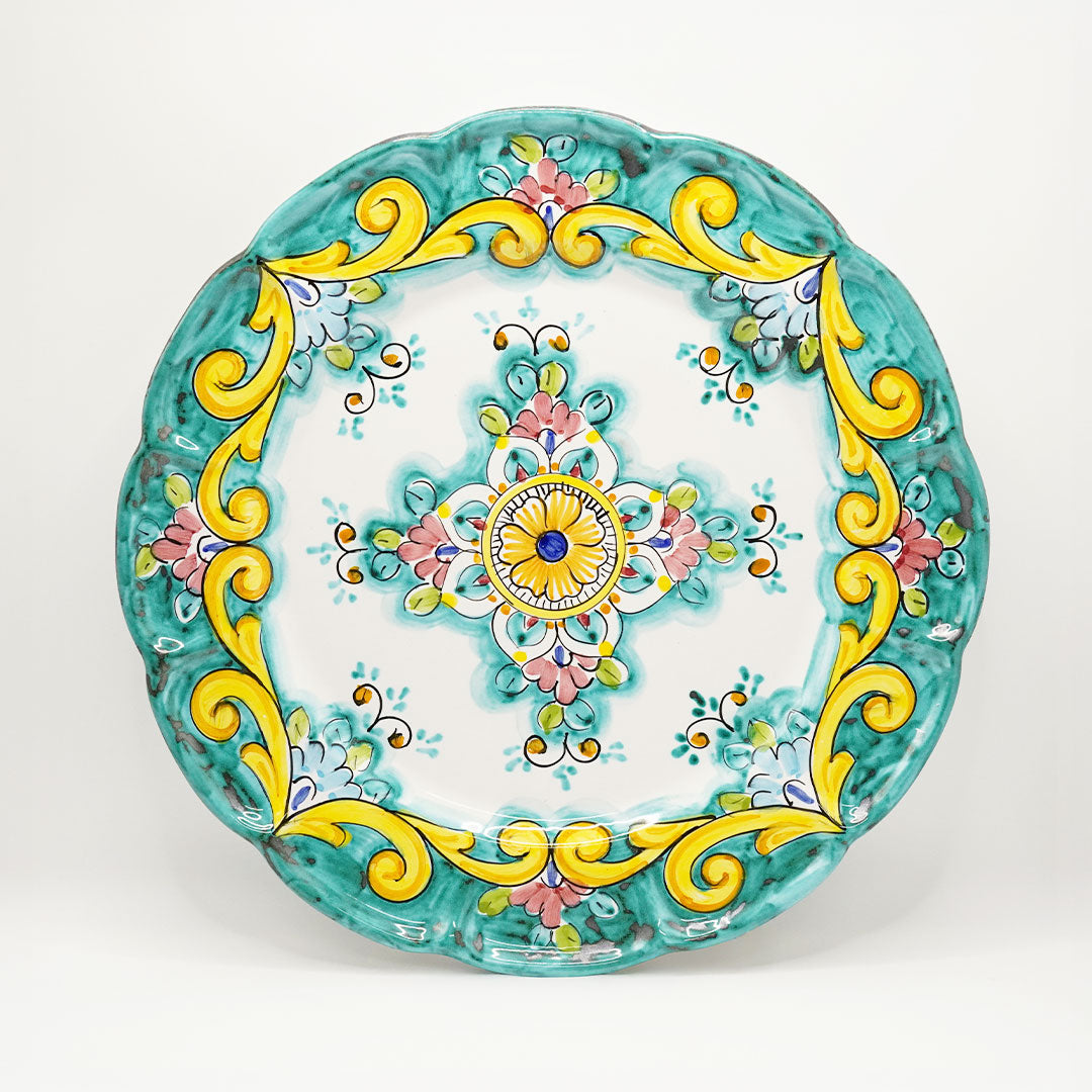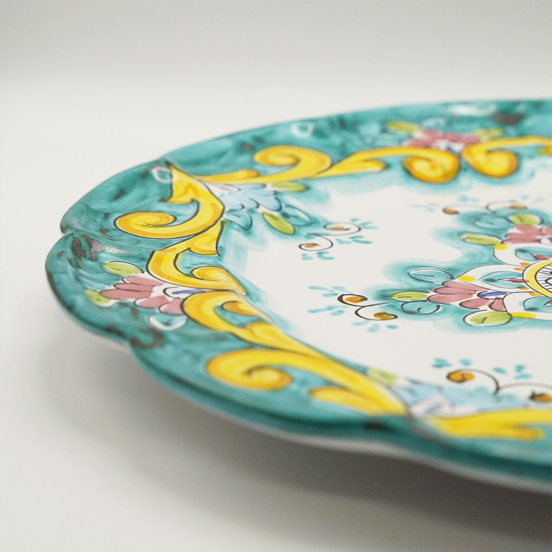 Piatto Barocco är ett vackert handmålat upplägningsfat i ett barockt mönster i en harmonisk palett av turkost, gult och vitt med subtila rosa detaljer. Fatet är både praktisk och dekorativt för servering eller som prydnad.