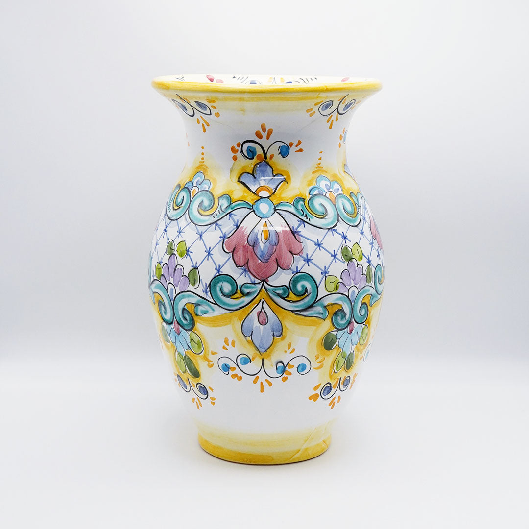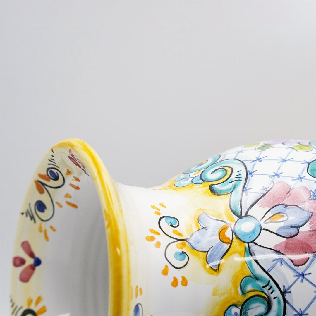 Portafiori Giallo är en handmålad vas som andas italiensk keramikkonst. Gul och vit färgkombination med rosa och turkosa detaljer i ett autentiskt handmålat mönster. Vasen passar perfekt till snittblommor eller som ett dekorativt objekt som tillför värme och personlighet till ditt hem.